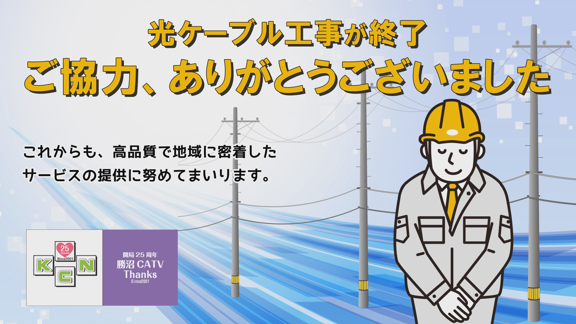 - 勝沼CATV株式会社では、2025年12月27日正午から2026年1月4日までの間を休業とさせていただきます。また、2026年1月5日より通常営業を開始いたします。ご了承いただきますようお願い申し上げます。