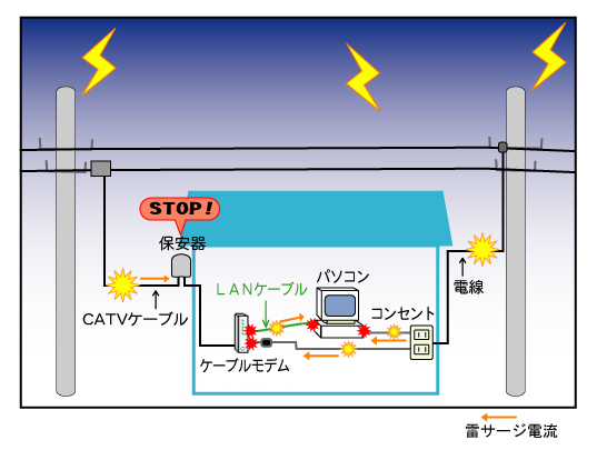 - CATVケーブルの場合、雷サージは保安器でガードされ、宅内に入ることはほとんどありません。