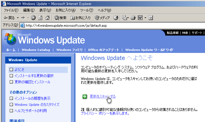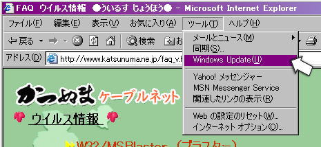 - Internet Explorerの「ツール」をクリック → 「Windows Update」をクリック