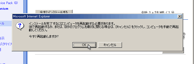 - インストールが完了するとダウンロードしたソフトウェアによって下図のようなウインドウが表示されますので、「OK」をクリックしてください。再起動が行なわれます。