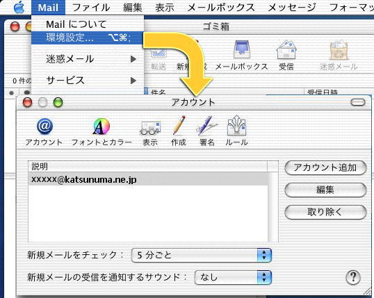 Mailをクリック→環境設定をクリック。