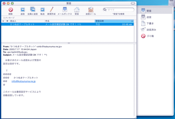 受信ボタンをクリックした後に、受信ボックスの中にメールが届けば設定は完了です。