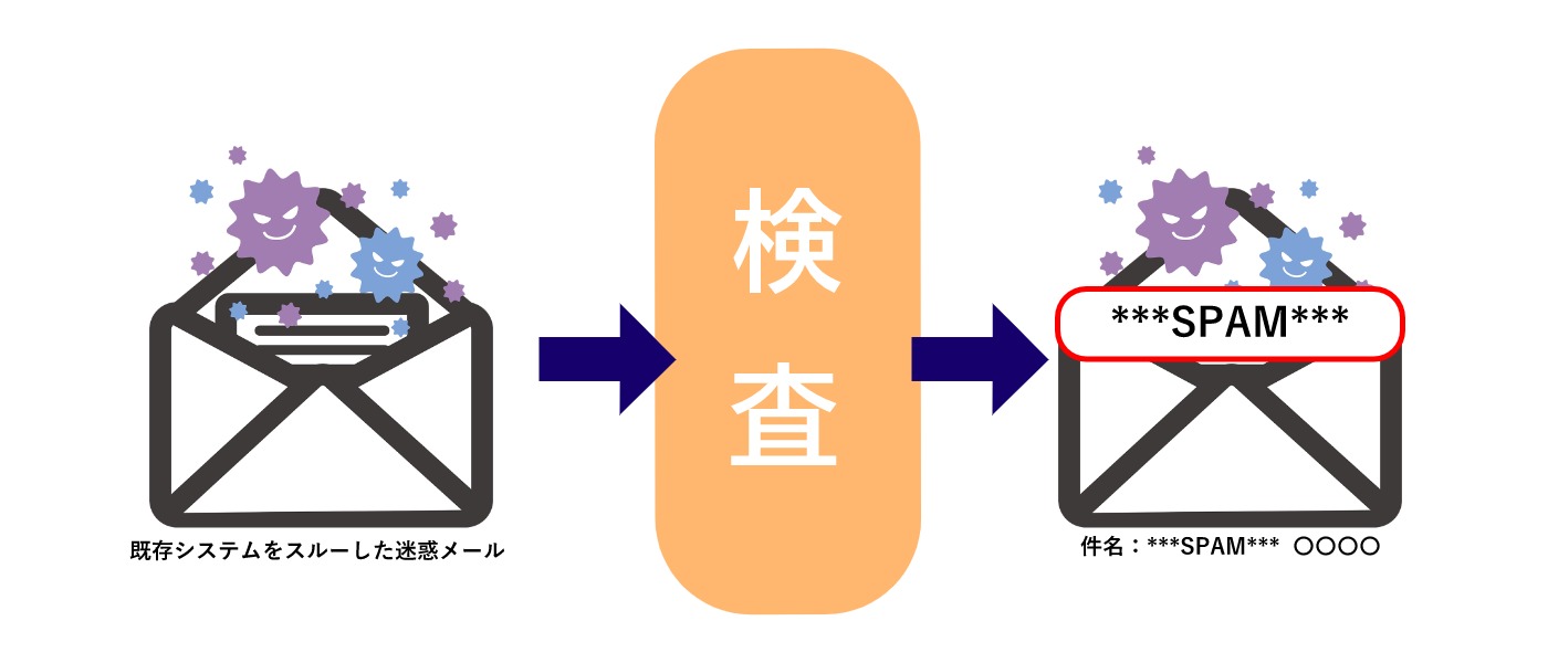 既存のシステムでは、迷惑メールは素通りする仕組みとなっておりますが、今回新たに導入した検出機能では、迷惑メールについて件名に「***SPAM***」を付与し、受信者に配送されるようになっております。