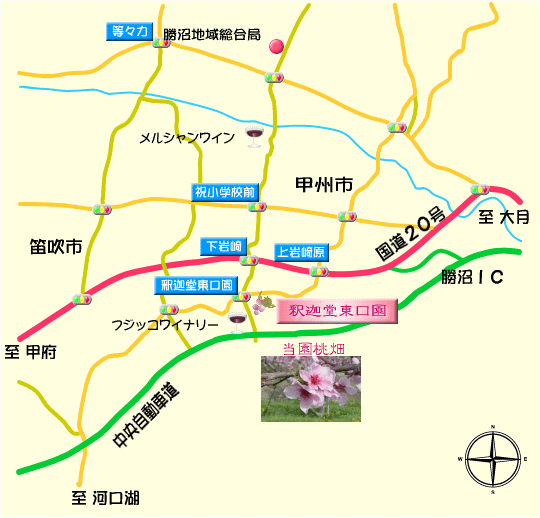 ナビ付きの車をお持ちの方 | 釈迦堂東口園で入力してください。案内されない場合がありますので![]() ![]() 多くの場合この辺りの中心である、「祝小学校前」信号近くの郵便局辺りに案内されます。 ポイントは国道20号の下岩崎の信号(歩道橋の有る小さい交差点)を甲府方面に向かって左折(東京方面に向かって右折)直ぐに「釈迦堂東口」の信号を左折してすぐ右側です。「釈迦堂東口」の交差点を検索して下さい。 北緯 35度38分49秒 東経 138度43分26秒 のあたりです。 |
