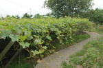 甲斐路に傘が付きました。たくさんあるので大変ですね。ブドウは雨に弱いと聞きました。ひょうが降っても実には傷がつかないでしょうか。 傘は二重になっていて、下側はビニール、上側は紙です。